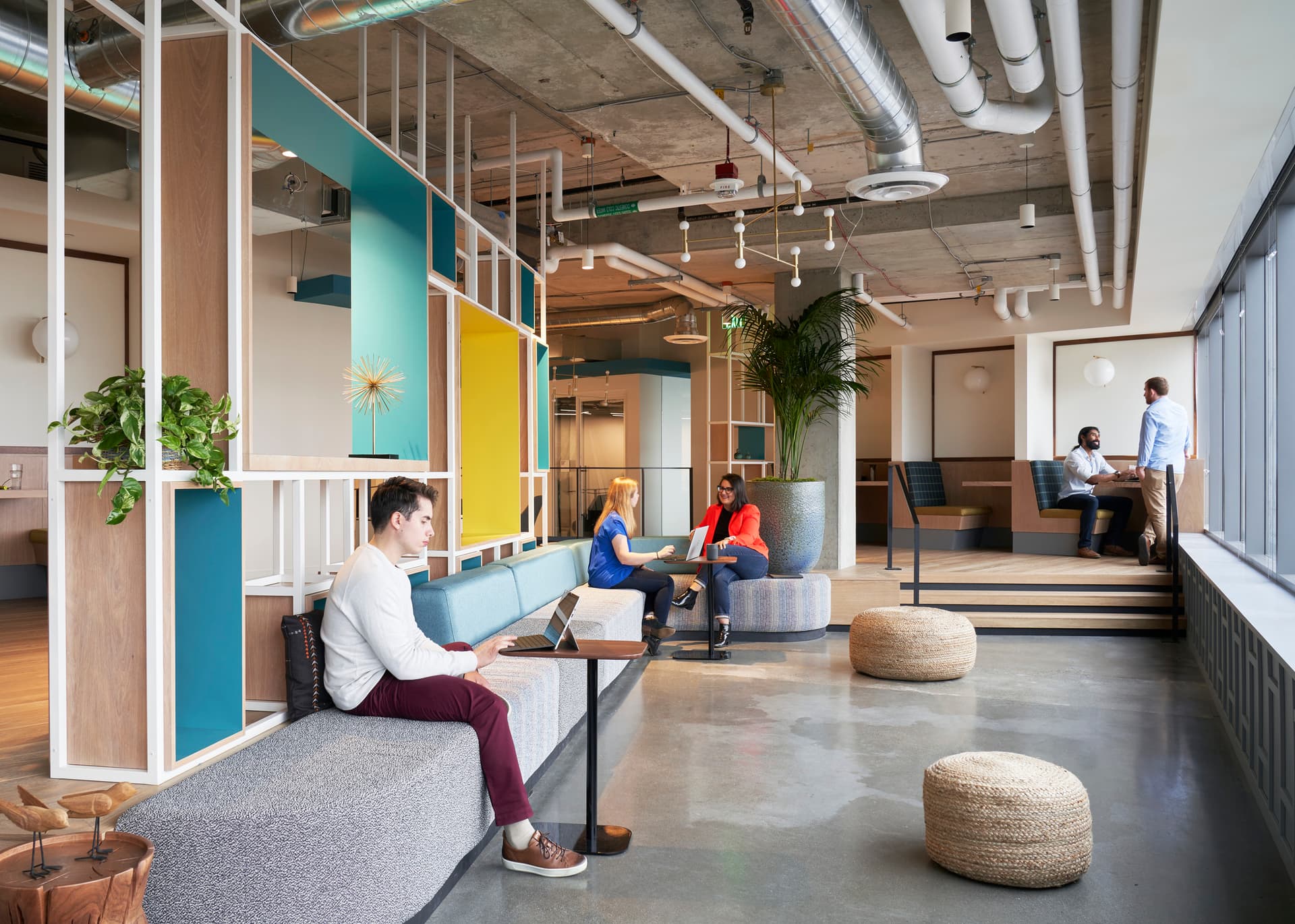 Designing for dandelions means creating distinct zones for collaboration. In the design of offices, these “dandelion zones” include centrally located hubs with open teaming and meeting areas, communal tables for coworking, and “mixer” tables that include screens so employees working remotely can feel more integrated into the office. Deliberately laying out the office floorplan with circulation designed to direct people to the center of activity and layering in amenities and other positive stimuli like music or art creates buzz among coworkers.