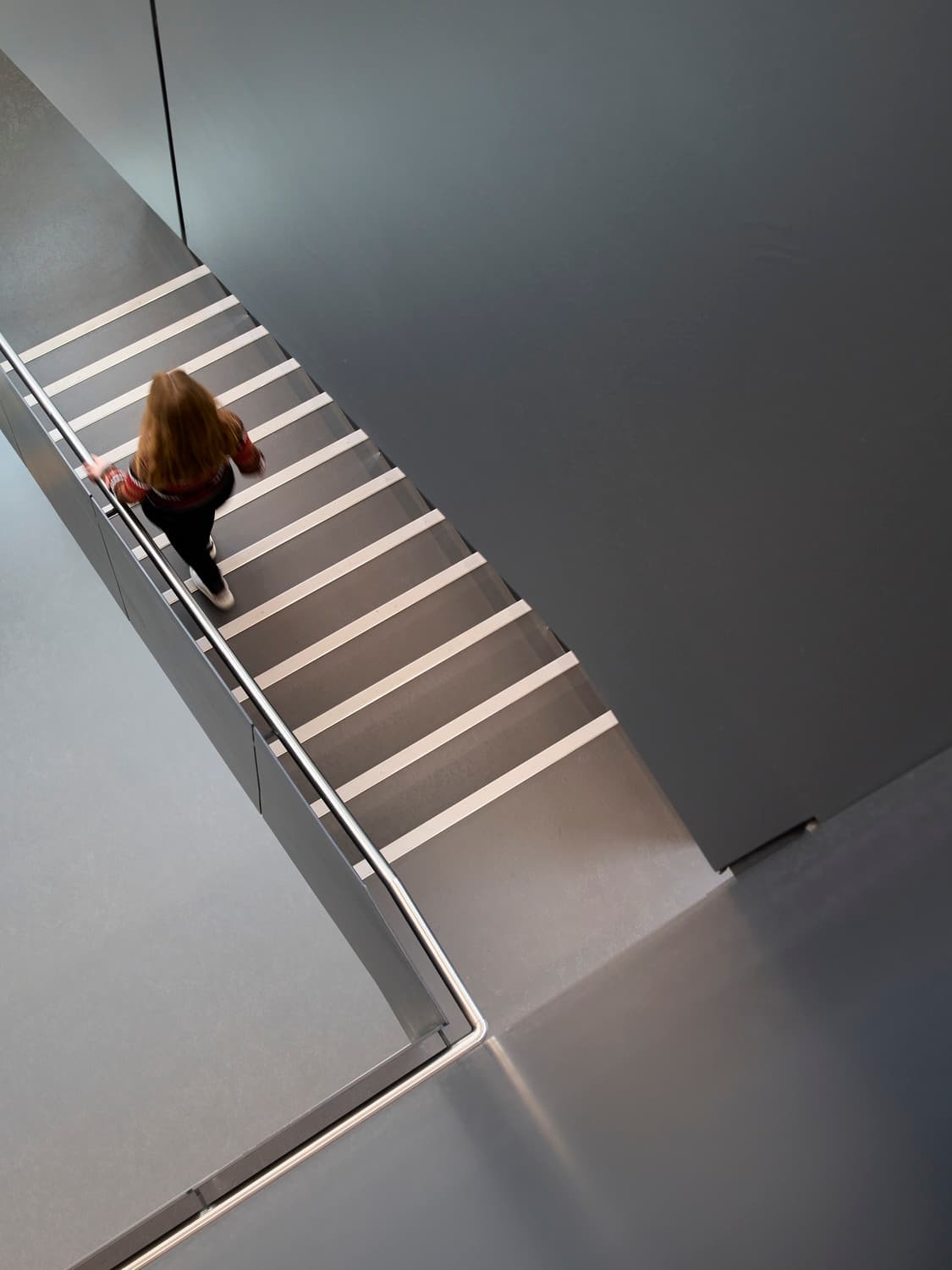 The 10-meter-high ground floor entrance is overlooked by a café at mezzanine level and offers views into the material testing spaces. Terraced floors provide visitors with glimpses into workspaces as they climb the staircase through a stepped, three-story atrium.