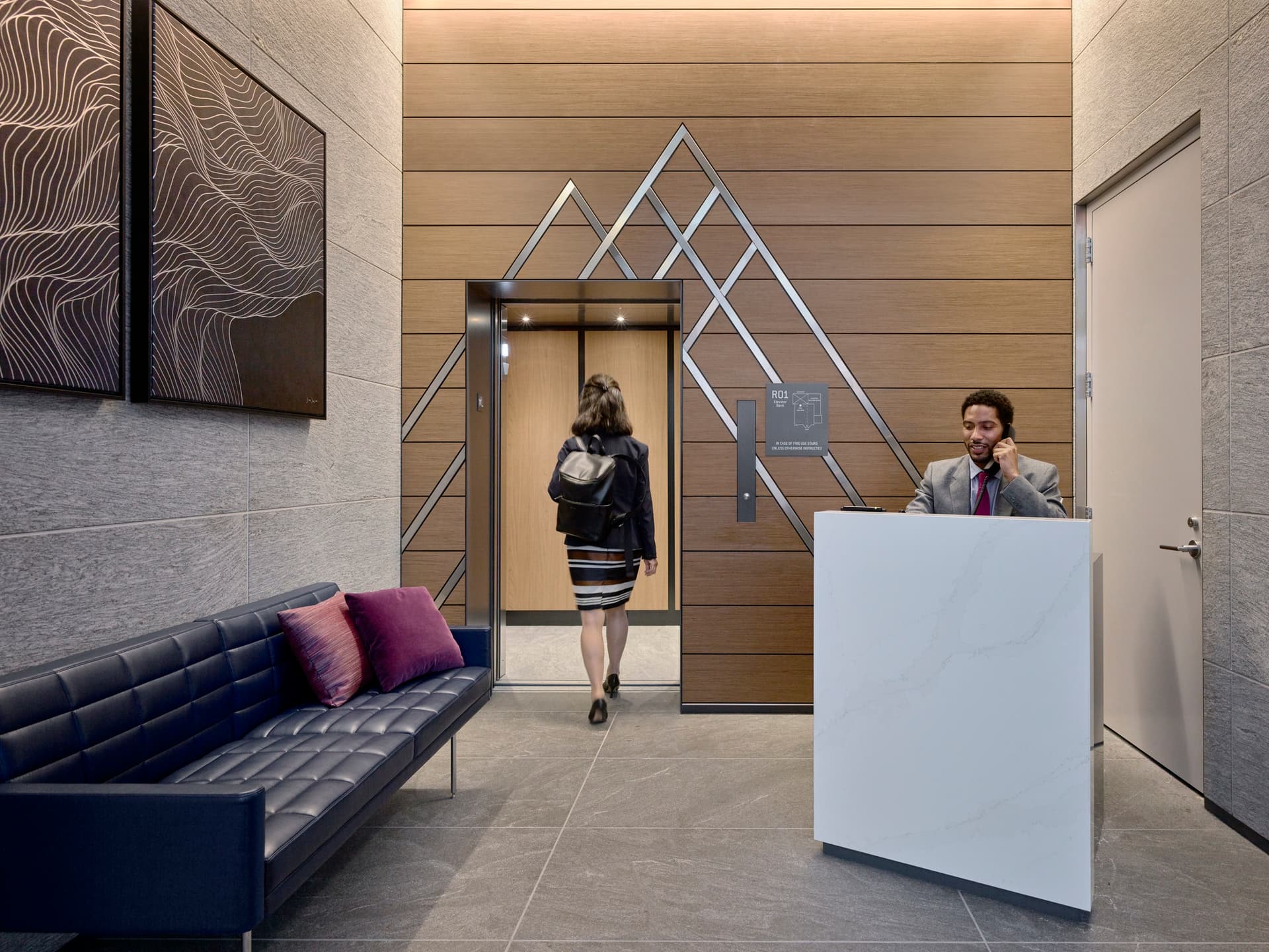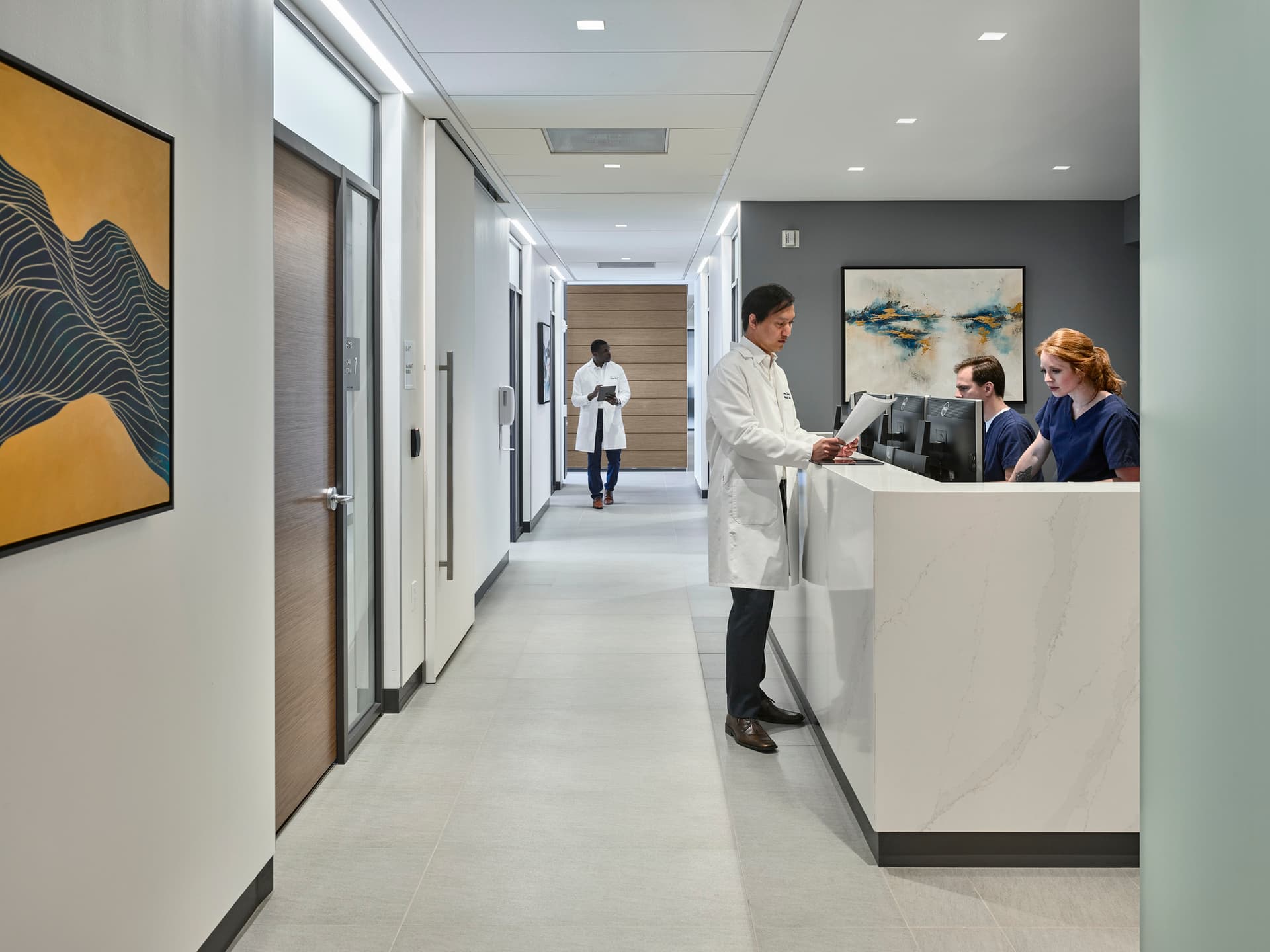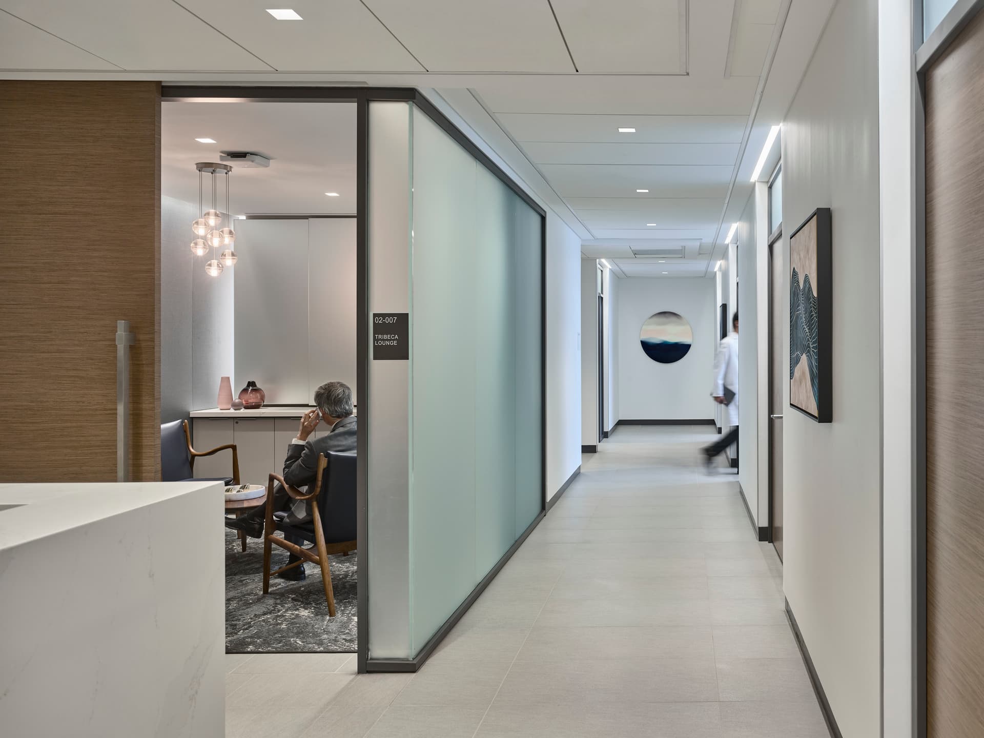 With no waiting for appointments, clinicians meet patients as they arrive—not in a traditional waiting room, but in a lounge space with coffee bar designed to support moments of respite or mobile work. Exam rooms are generous in size and designed to accommodate providers across the multi-disciplinary team. An executive lounge offers a quiet, well-appointed room for remote working or a space for patients’ guests.