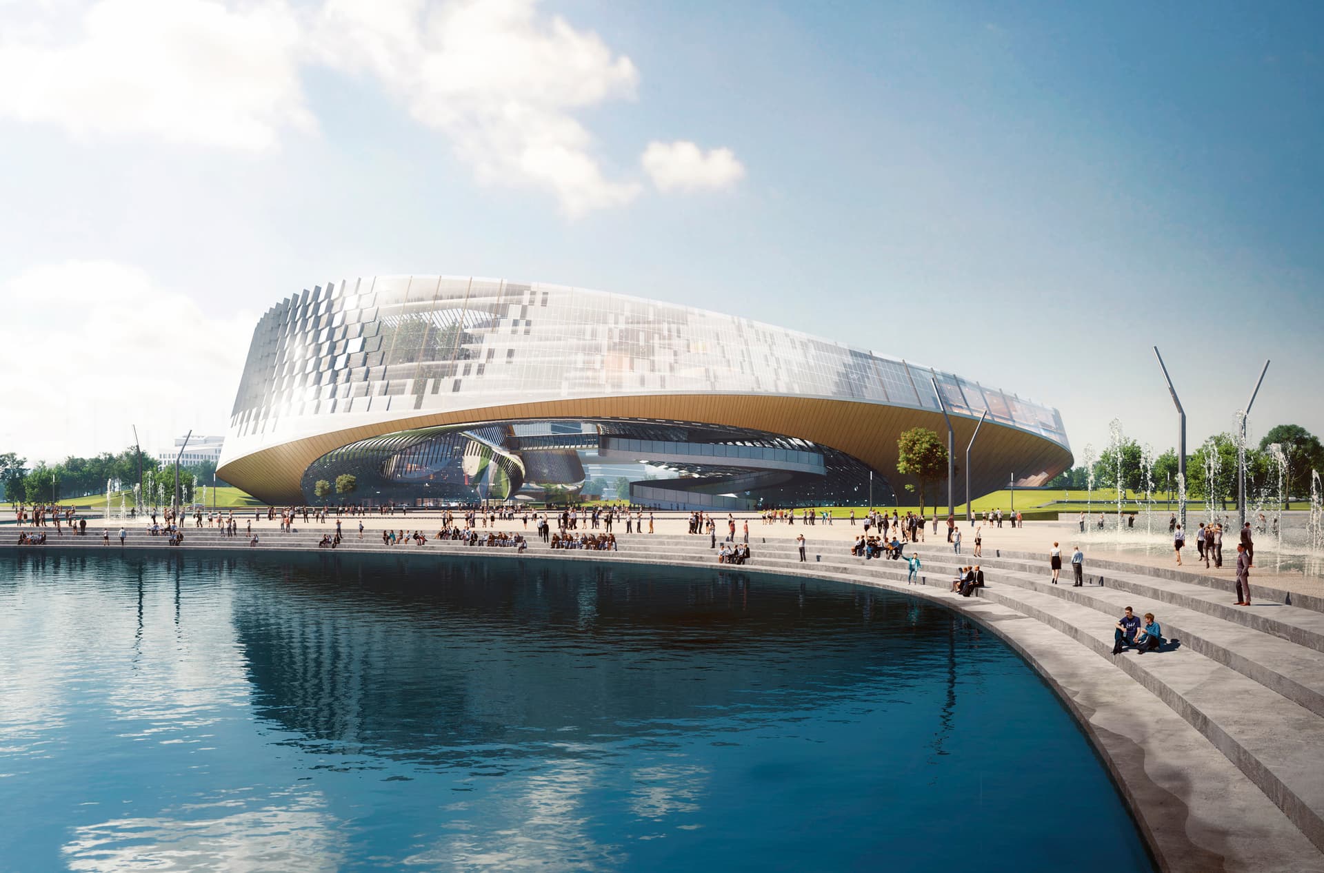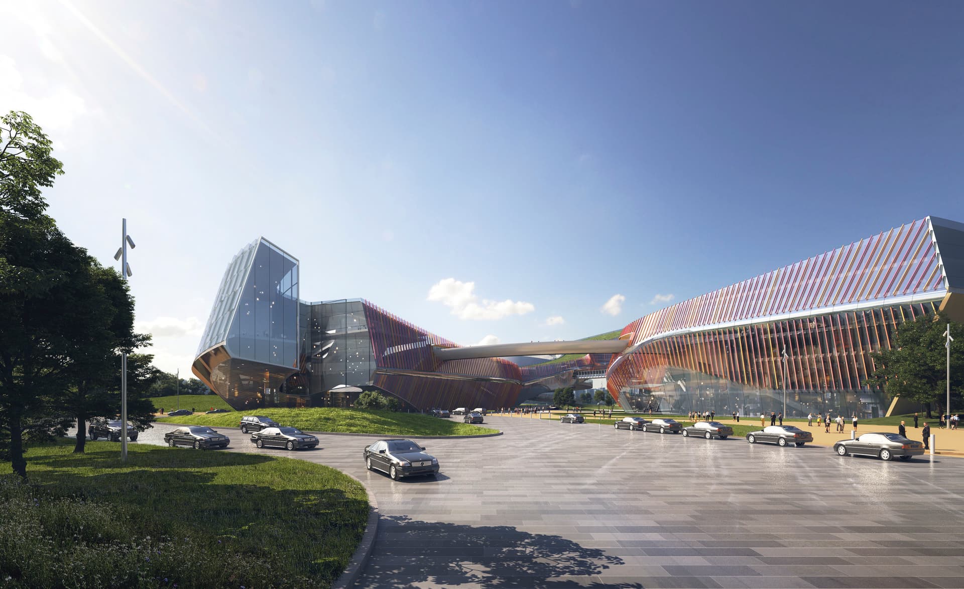 Part of the greater Tencent Shenzhen Headquarters Project (Net City), and located at the tip of Qianhai Bay, the convention center evokes a dramatic maritime gateway with arcs, lifts and curves that form dynamic and beautiful plazas and courtyards. A waterfront park surrounds the civic center with a series of zones and activities weaving in, around and under the building.