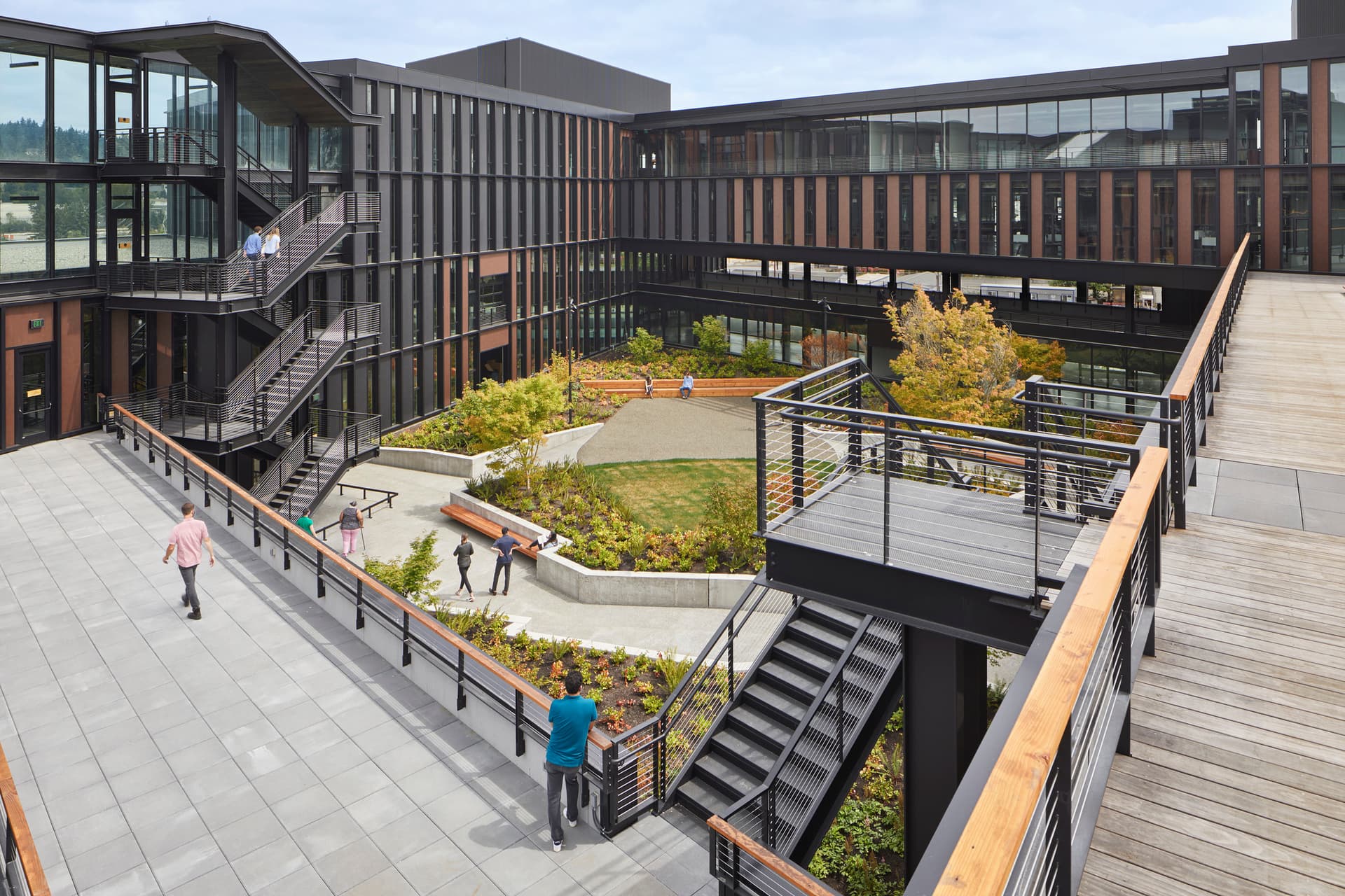 The design principle, “everything outdoors,” shapes the workplace, enabling work to move seamlessly from indoors to outdoors and back again. This includes multiple stairwells both inside and outside that encourage movement—as well as two central outdoor courtyards and roof gardens that flow into the open workspaces on the upper floors. A planned pedestrian path through the campus will simplify access to a future light rail station.