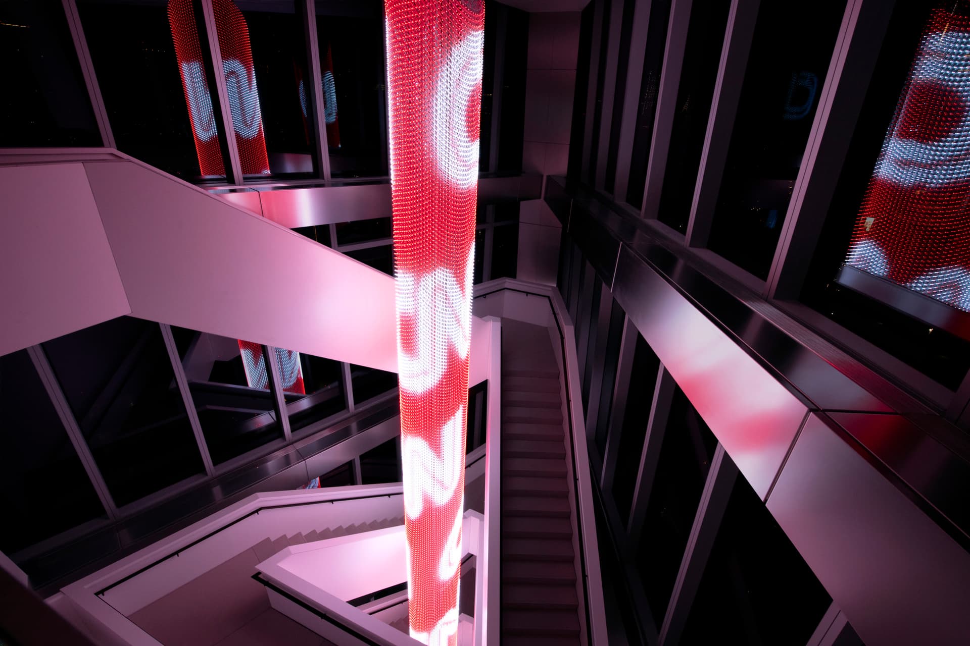 The showpiece is a 65-foot digital sculpture for the spiral staircase in the building’s glass “prow.” The sculpture’s seemingly random patterns of color and light are actually algorithmically-generated abstractions of WarnerMedia content. Tablets at the top and bottom of the staircase explain the content sources.